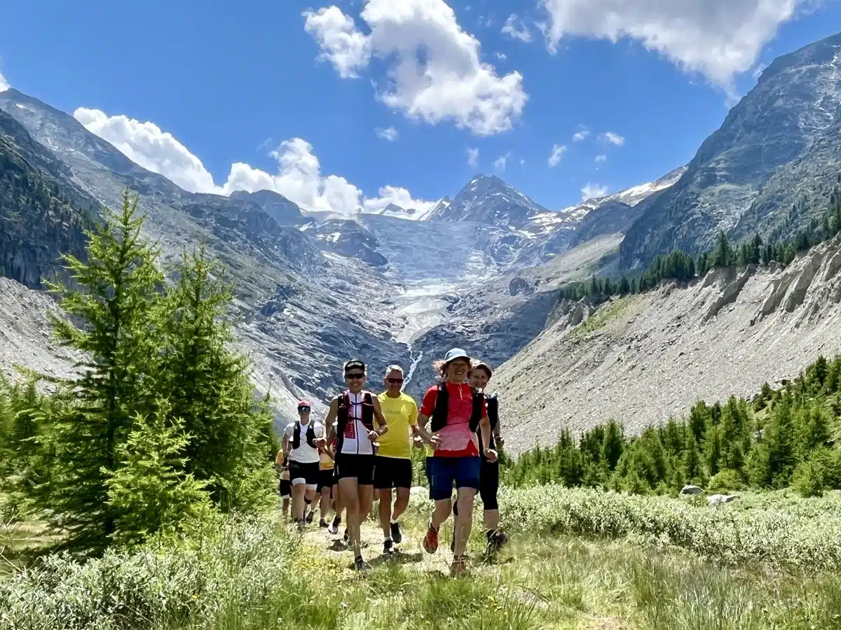 Mehrere Läufer in imposanter Berglandschaft umgeben von kleinen, grünen Bäumen.